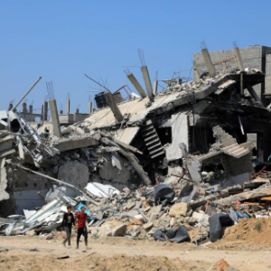 4月16日,在加沙地带南部城市汗尤尼斯,人们走过损毁的建筑。新华社发(里泽克·阿卜杜勒贾瓦德摄)