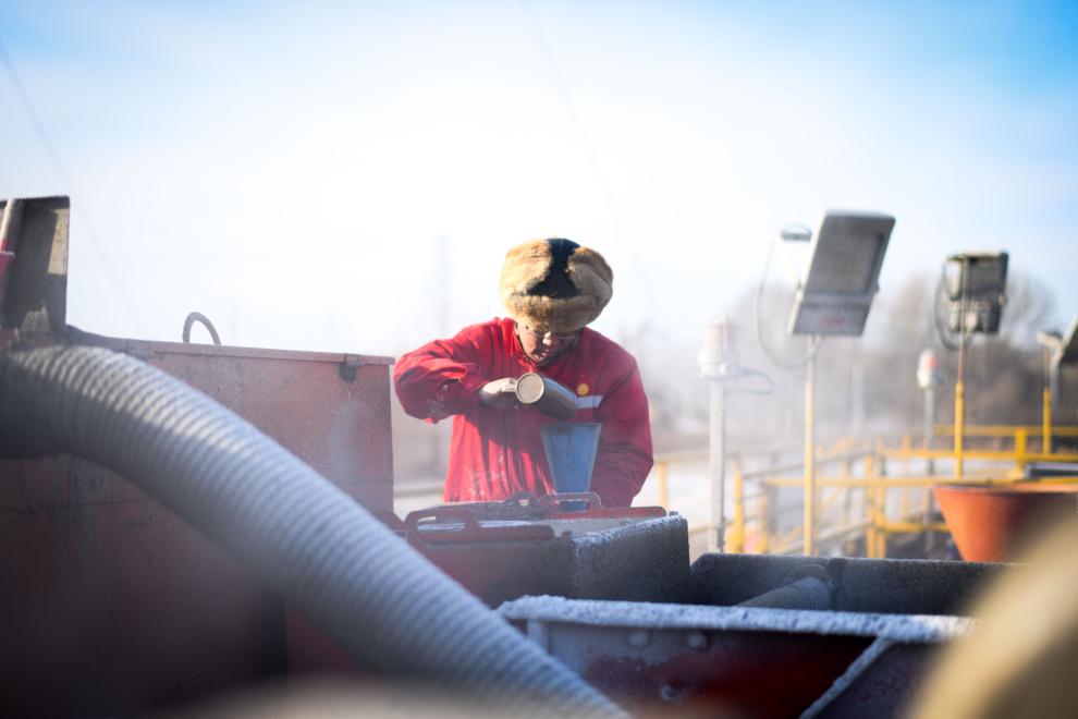 2024年3月28日,1205钻井队队长张晶(左)进行日常巡检中查看振动筛上的岩样。