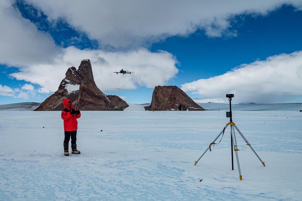 中国第40次南极考察队员褚馨德在格罗夫山执行无人机航测任务。(新华社发)
