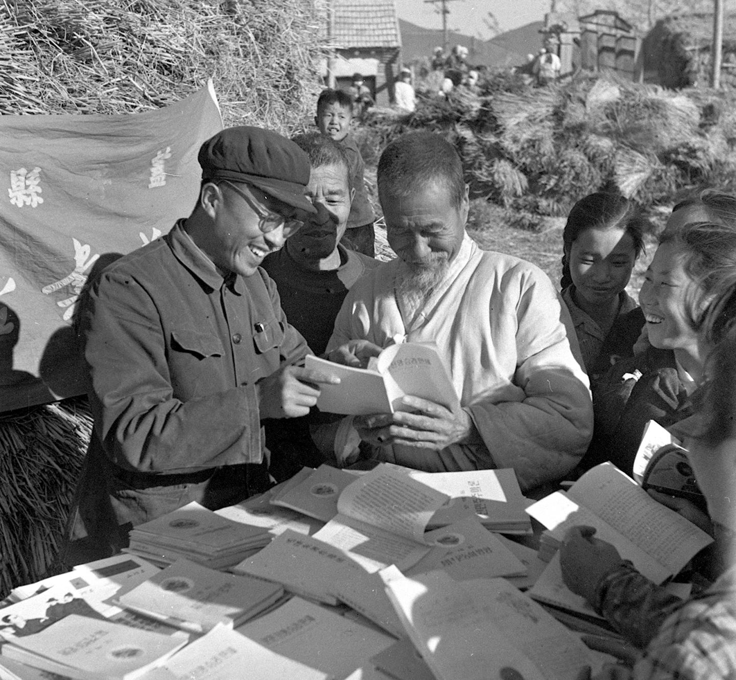 1965年,辽宁省盖县新华书店工作人员(左)送书下乡,在生产现场就地售书。