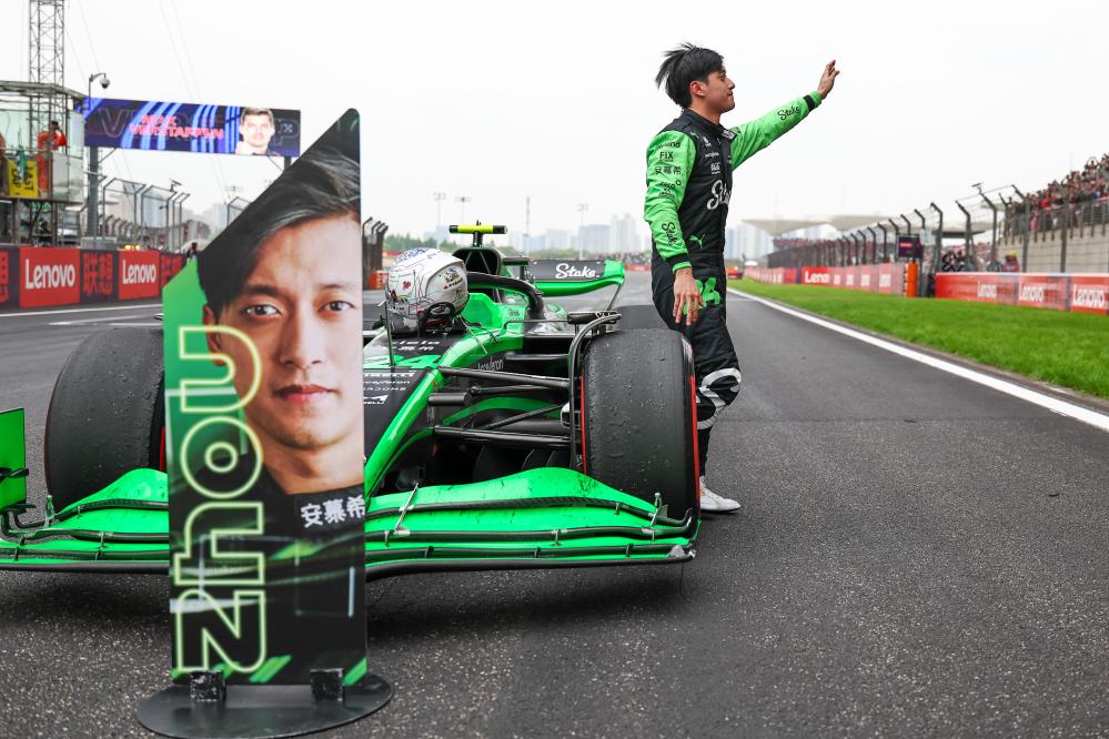 4月21日,索伯车队中国车手周冠宇在F1中国大奖赛后向看台观众挥手致意。 新华社发(钱俊摄)
