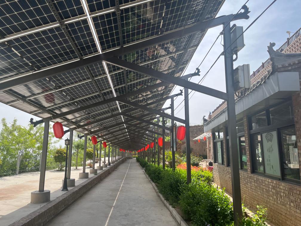 黄河北岸的晋南地区,午后的气温已接近30度,在村子南边的小道上,全长173米的光伏廊道成为乘凉的好去处。光伏板遮蔽的长廊下,有绿植、灯笼装点,不远处就能眺望到国家级湿地保护区圣天湖和壮阔的母亲河。