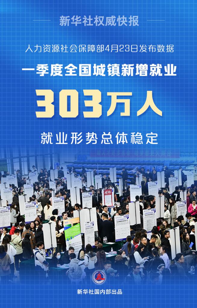 人力资源和社会保障部4月23日发布数据,一季度全国城镇新增就业303万人。按照今年“1200万人以上”的城镇新增就业目标,一季度已完成全年任务的四分之一。3月份全国城镇调查失业率5.2%,就业形势总体稳定。