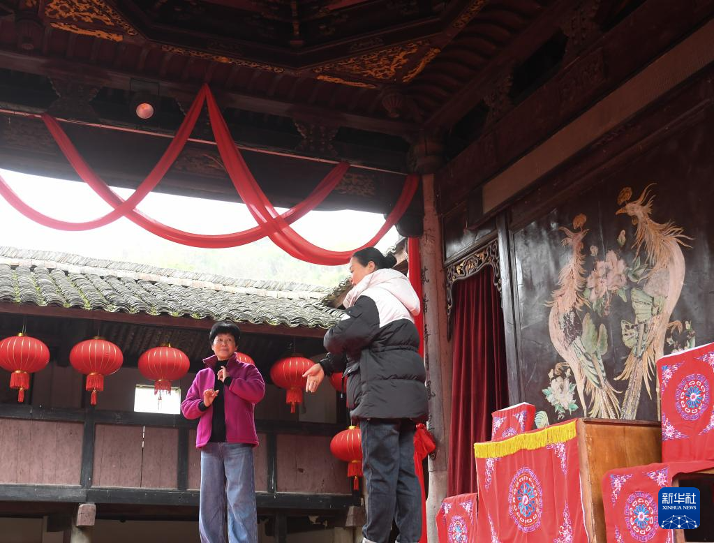 在绍兴嵊州一处乡村老戏台,越剧演员在排练(2024年2月21日摄)。新华社记者 翁忻旸 摄