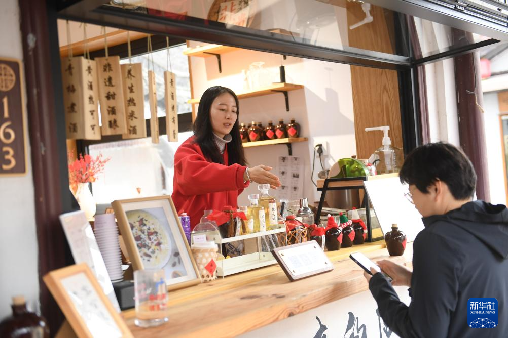 2024年2月20日,在绍兴仓桥直街,一家黄酒创意饮品店的店主在指导顾客下单。新华社记者 翁忻旸 摄