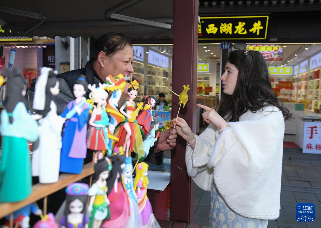 2024年1月15日,游客在杭州清河坊和糖塑艺人交流。新华社记者 翁忻旸 摄