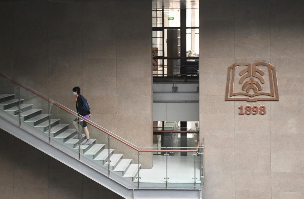 2024年4月8日,一名学生在北京大学图书馆新书展阅厅读书。