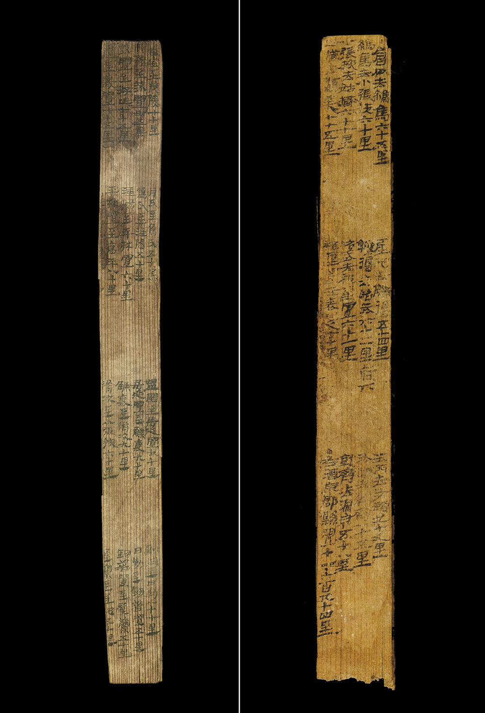 这是出土于今内蒙古自治区额济纳旗破城子遗址的《居延里程简》(左)和出土于甘肃省敦煌市悬泉置遗址的《悬泉里程简》(拼版照片,资料照片)。新华社发(甘肃简牍博物馆供图)