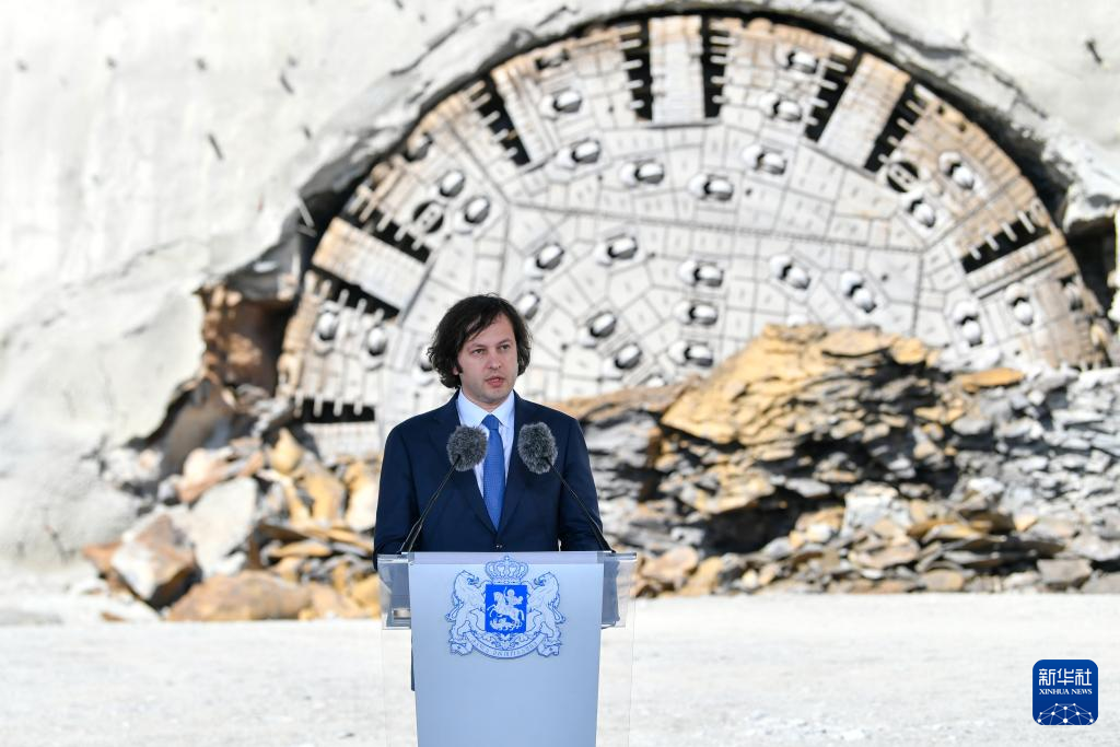 4月23日,在格鲁吉亚科维谢提,格鲁吉亚总理科巴希泽在贯通仪式上讲话。新华社记者 曹阳 摄