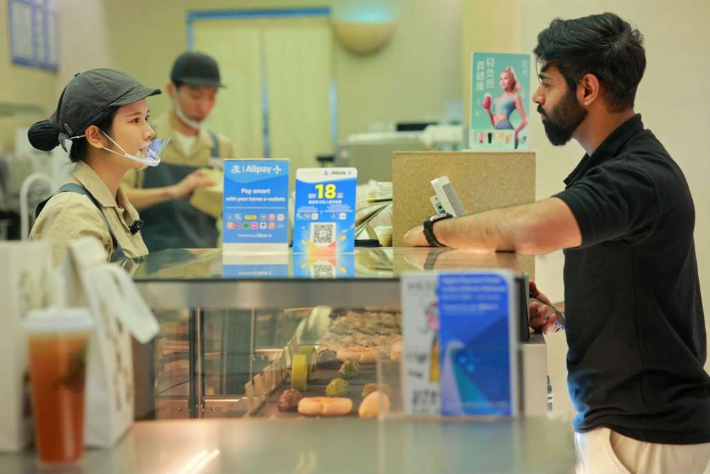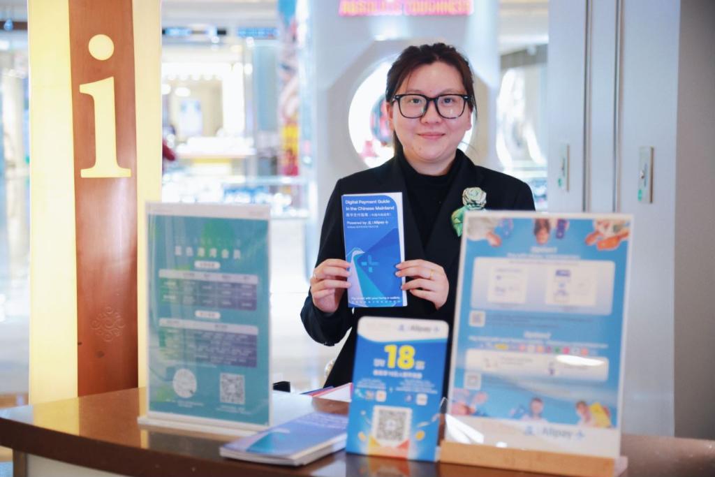 走进蓝色港湾,可以看到一些商家收银台前放有Alipay+的便利支付指南,多处也摆放有英文提示牌,提示指导外籍游客如何绑定Visa国际卡或境外电子钱包进行移动支付。