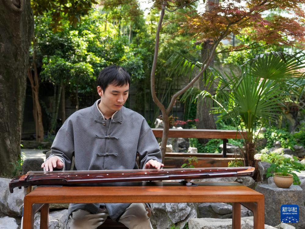 4月22日,古琴老师高廷鑫在扬州仁丰里的永乐琴坊弹奏《梅花三弄》。