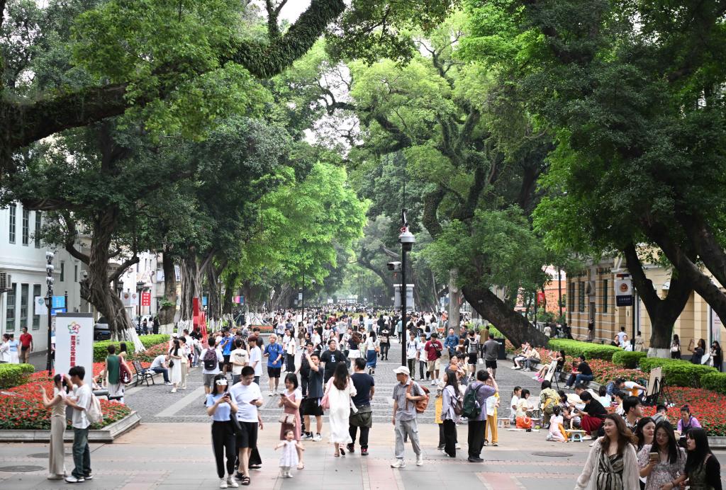 游客在广州沙面大街休闲游玩(4月13日摄)。