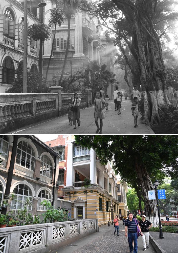 拼版照片:上图为广州沙面大街街景(资料照片);下图为2024年4月11日在同一位置拍摄的广州沙面大街。