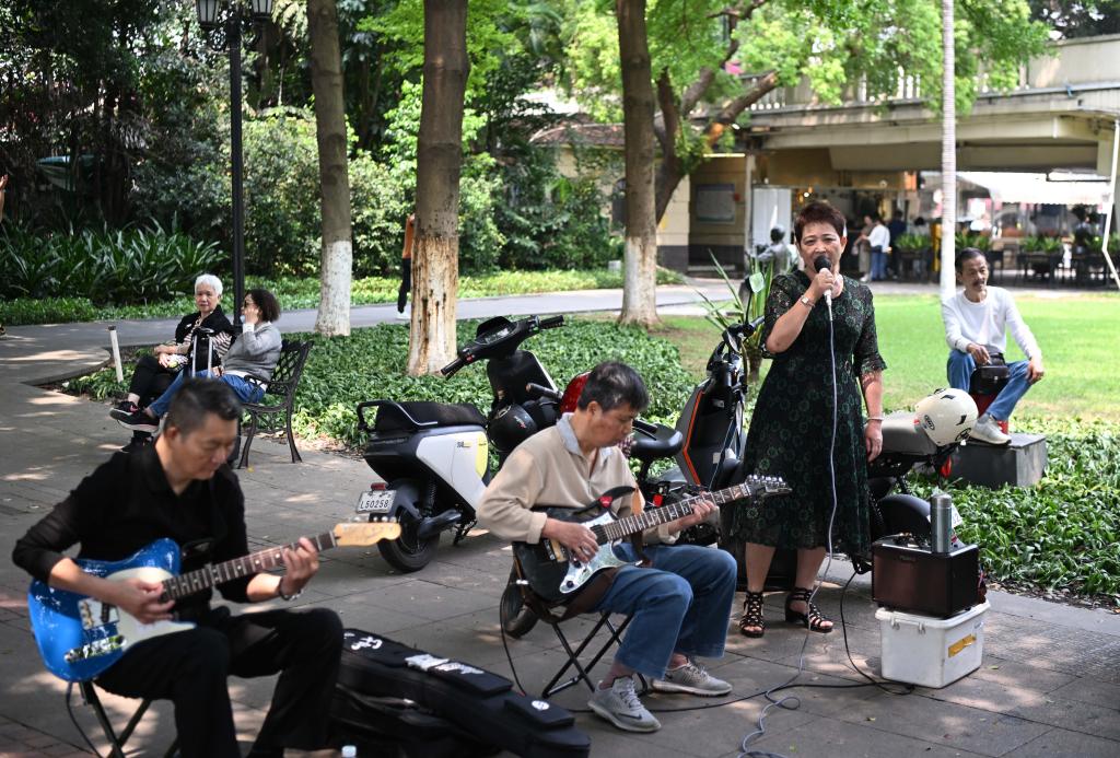 市民在广州沙面唱歌休闲(4月11日摄)。