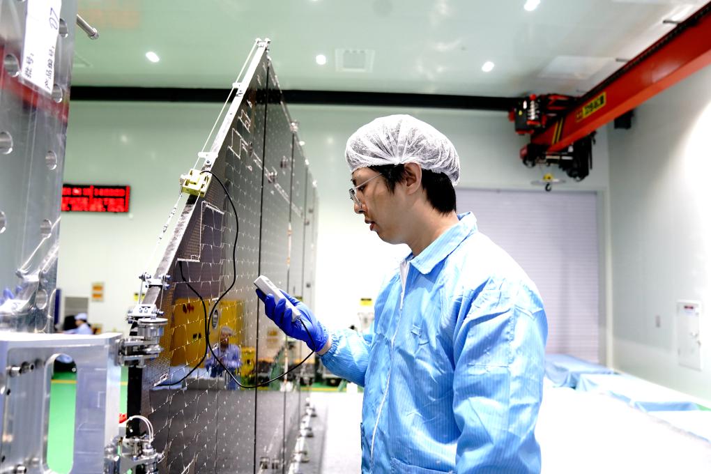 4月18日,在微小卫星创新研究院的厂房,工作人员检测卫星太阳能帆板。新华社记者张建松 摄
