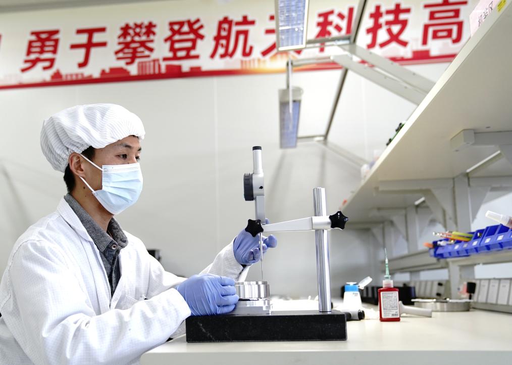 在中国科学院微小卫星创新研究院的厂房,工作人员对批量化生产的卫星姿控组件进行检测(4月18日摄)。新华社记者张建松 摄