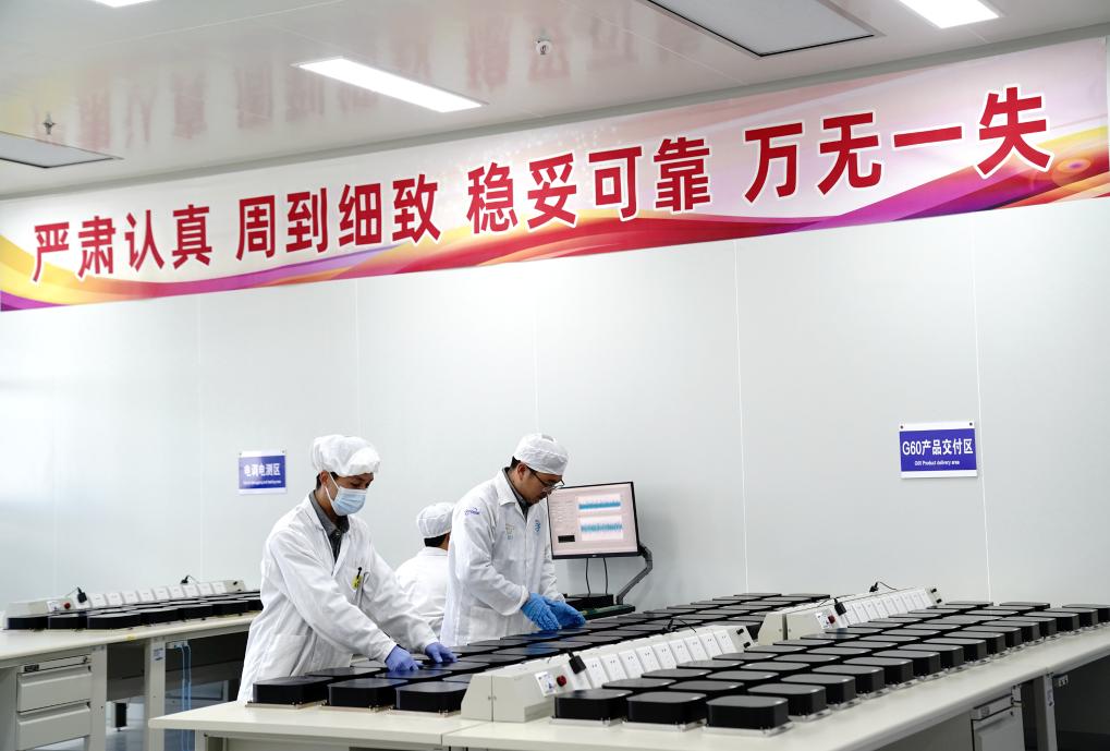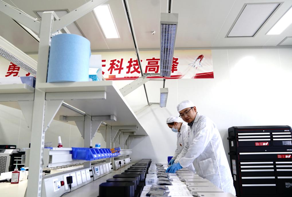 4月18日,在微小卫星创新研究院厂房的产品交付区,工作人员检查批量化生产的卫星姿控组件。新华社记者张建松 摄