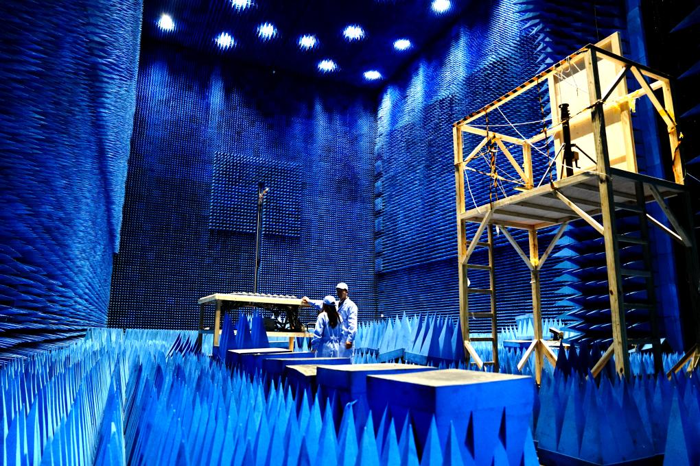在中国科学院微小卫星创新研究院的微波暗室,科研人员进行批量化生产的卫星单机测试(4月18日摄)。新华社记者张建松 摄