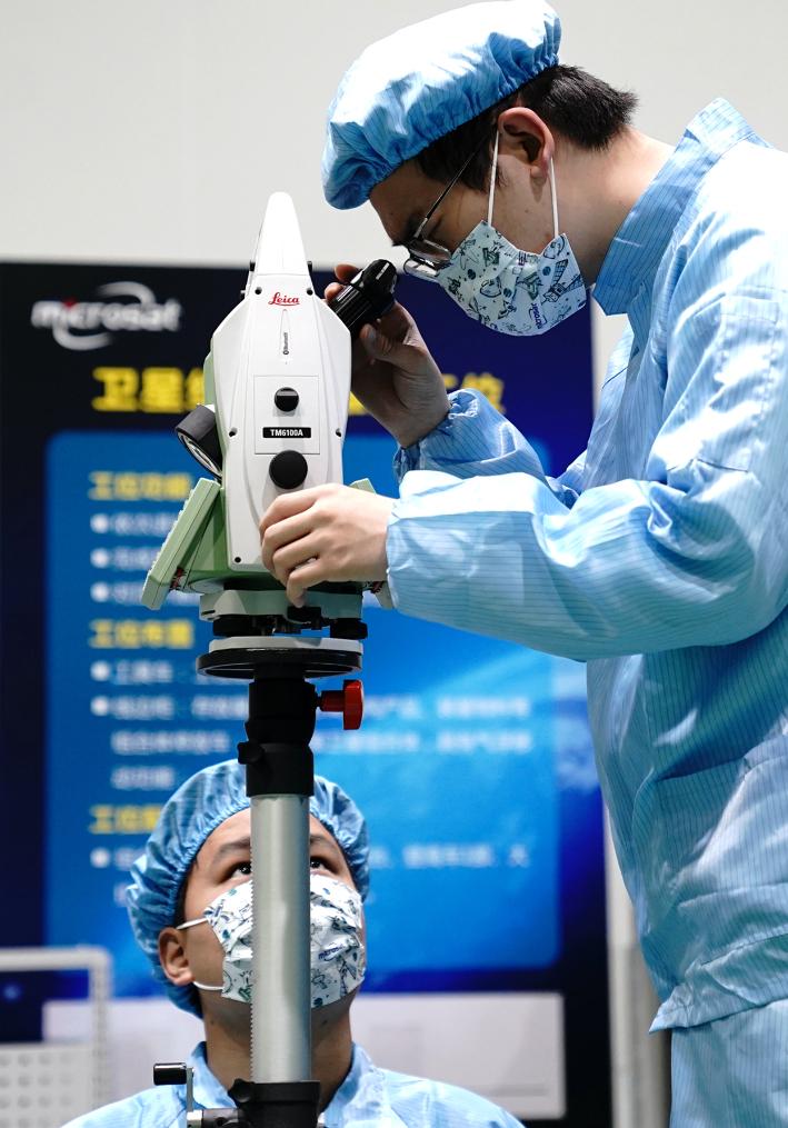 在中国科学院微小卫星创新研究院的厂房,工作人员检测批量化生产的单机产品精度(4月18日摄)。新华社记者张建松 摄
