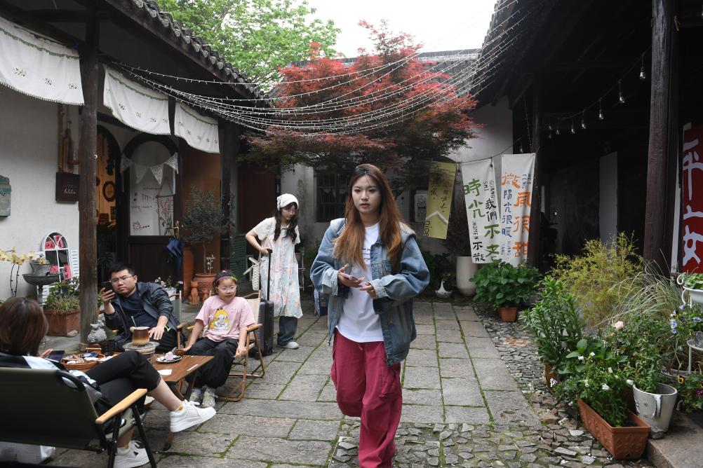 游客参观老湖州人应国宏在小西街自家院落布置的绿植自助售卖点(4月21日摄)。游客可扫码自助购花。