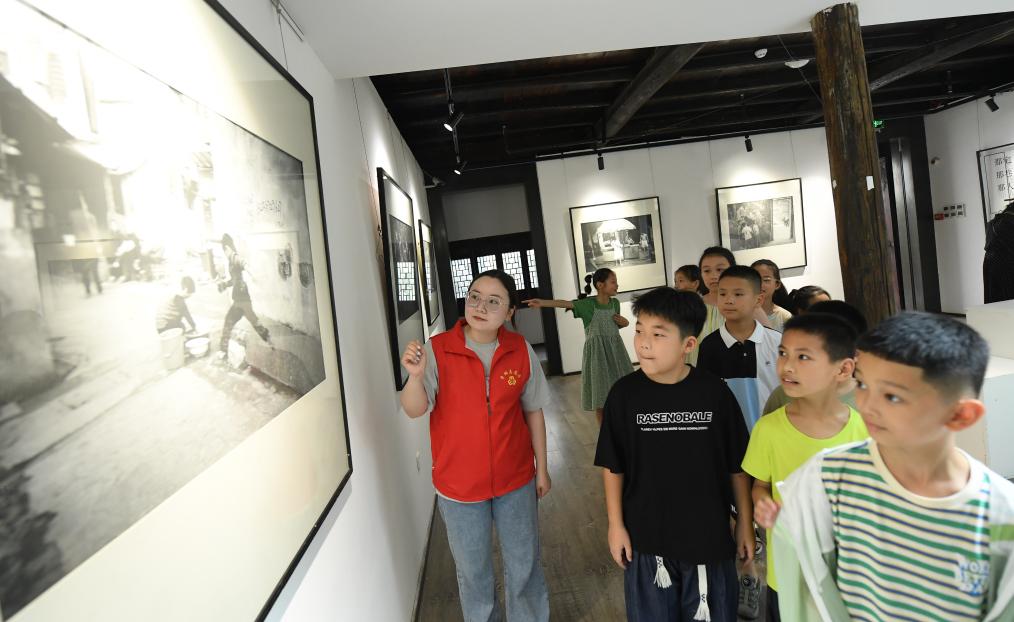 前来研学的青少年在小西街的西岸当代美术馆观看老街历史照片(2023年7月19日摄)。