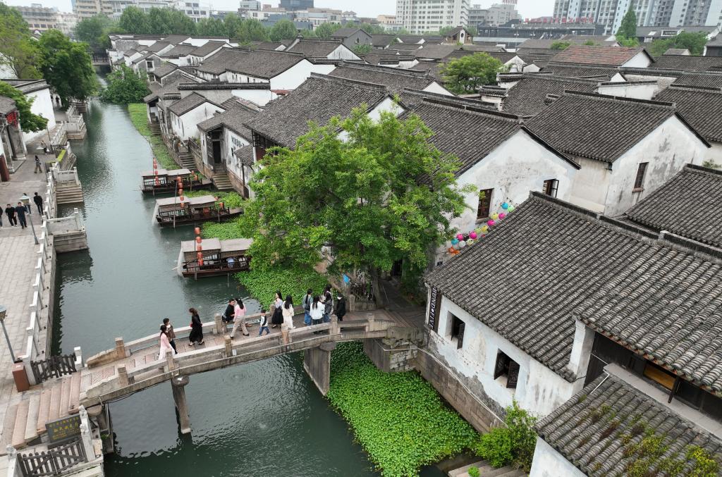 游客在小西街游览(无人机照片,4月21日摄)。