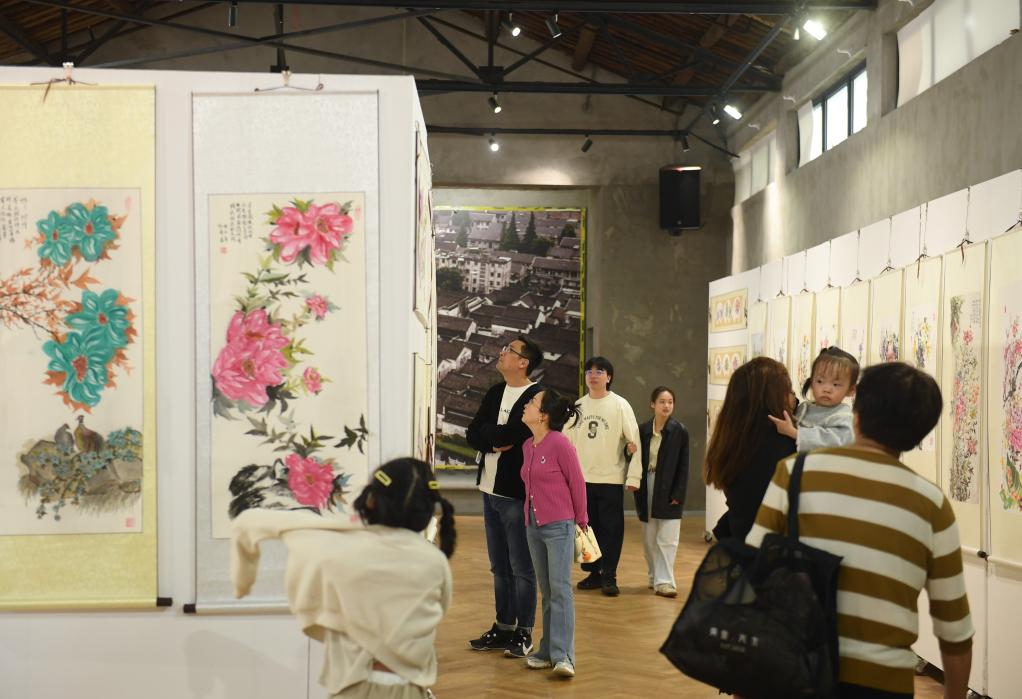 人们在小西街观看湖州本地画家陶希英的画展(4月21日摄)。