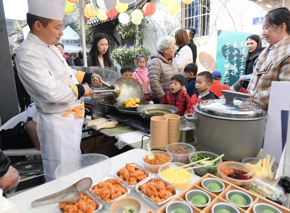 在小西街举办的新春市集上,“浙江工匠”蔡林荣(左)为人们制作当地特色小吃细沙羊尾(1月13日摄)。