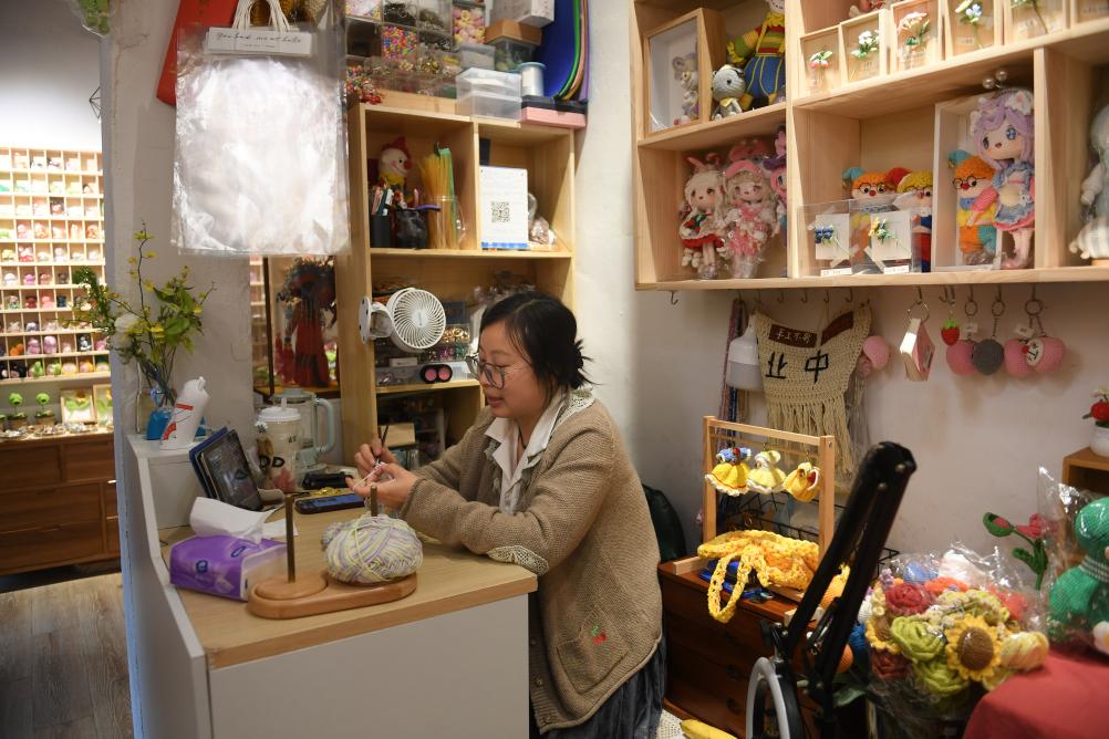 手作爱好者王月芳在设在小西街的工作室做编织(4月21日摄)。