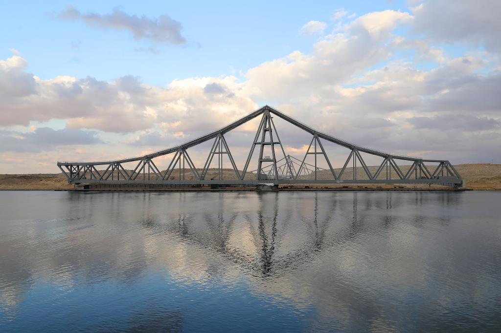 在运河伊斯梅利亚段,一座由中国企业承建的双翼平旋铁路桥已完成各项应用测试,进入项目移交最后阶段。随着巨大的机械转动装置启动,重1.5万吨、总长640米的大桥两翼缓缓旋转,宛如两条巨臂,在运河中间稳稳相握,将亚非两洲相连。大桥正式启用后,将成为埃及对西奈半岛进行开发建设的核心通道。