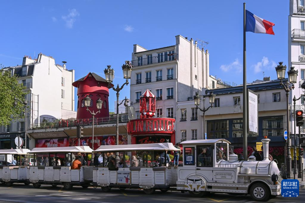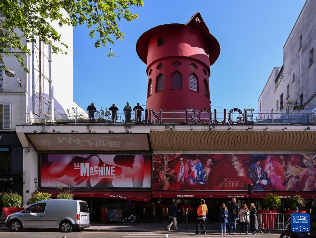 这是4月25日在法国巴黎拍摄的叶片掉落后的巴黎地标红磨坊风车。新华社发(朱利安·马蒂亚摄)