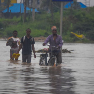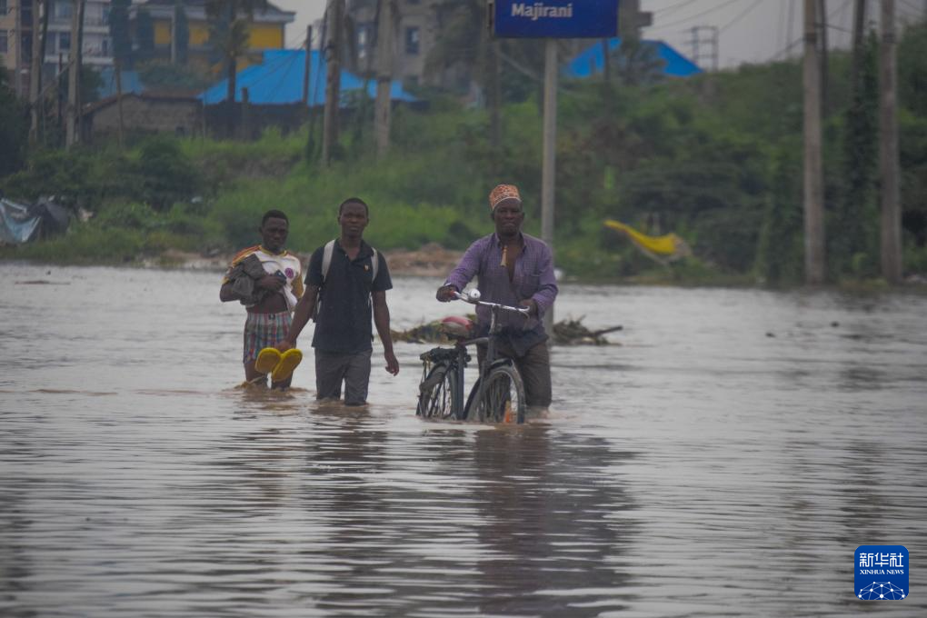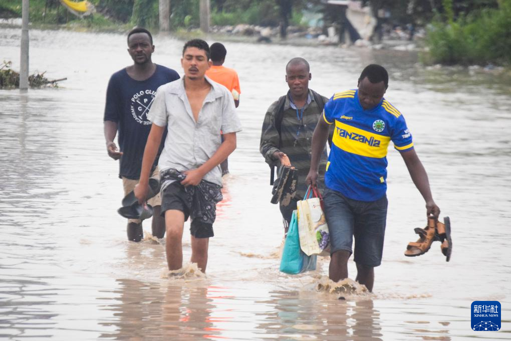 4月25日,在坦桑尼亚达累斯萨拉姆,人们走过洪水淹没的道路。新华社发(赫尔曼·埃马纽埃尔摄)