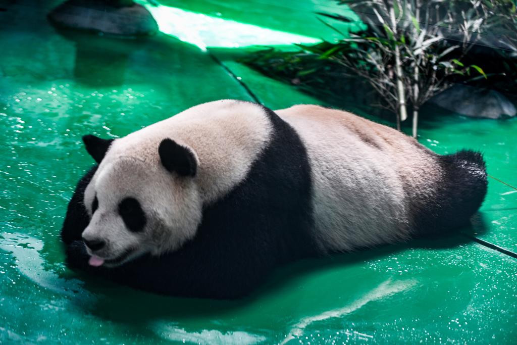 4月25日,在兰州野生动物园大熊猫馆,大熊猫“满满”在吐舌头。新华社记者 郎兵兵 摄