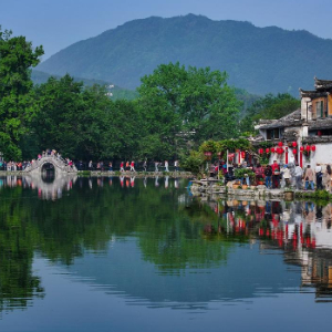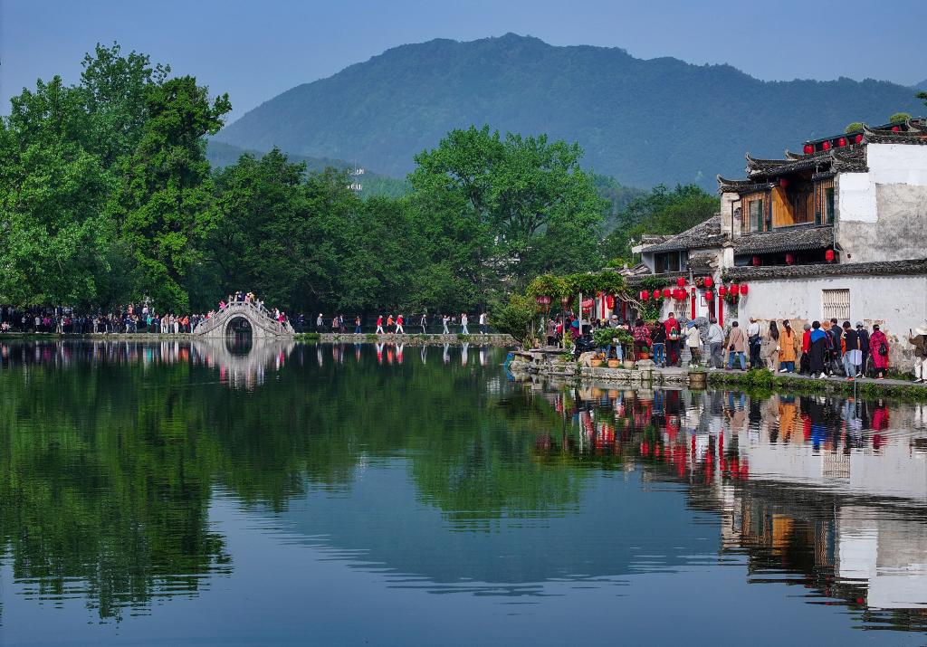 4月24日,游客在世界文化遗产地安徽省黄山市黟县宏村游玩(无人机照片)。新华社发(施亚磊摄)