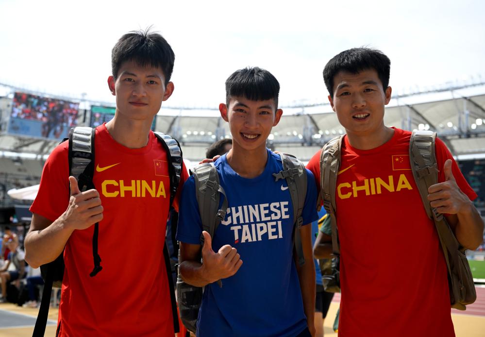 2023年8月23日,中国选手张溟鲲(左)、张景强(右)与中国台北选手林昱堂在2023世界田径锦标赛男子跳远资格赛后合影。新华社记者 宋彦桦 摄