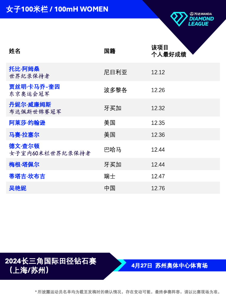 2024年4月20日,2024年世界田联钻石联赛厦门站女子100米栏比赛中,中国选手吴艳妮(右一)以13秒04的成绩获得第十名。新华社记者 李明 摄
