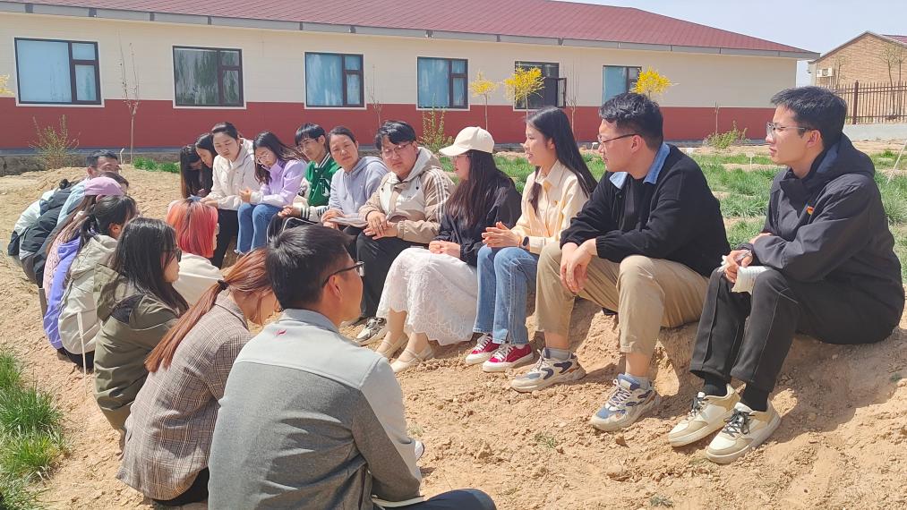 宁夏盐池饲草科技小院的田地里,宁夏大学师生围绕“厚植爱农情怀 练就兴农本领”交流感想。(受访者供图)