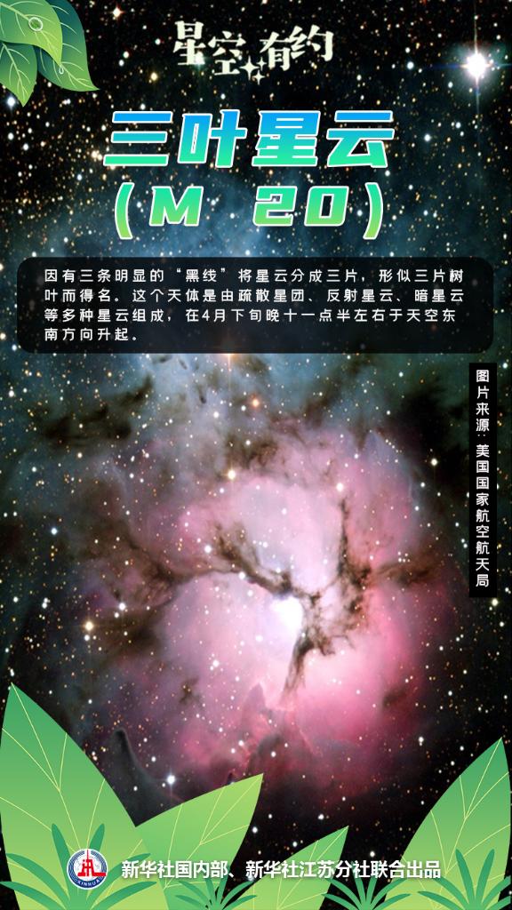 花儿少不了叶子的衬托。位于人马座的三叶星云(M 20),因有三条明显的“黑线”将星云分成三片,形似三片树叶而得名。这个天体是由疏散星团、反射星云、暗星云等多种星云组成,在4月下旬晚十一点半左右于天空东南方向升起。