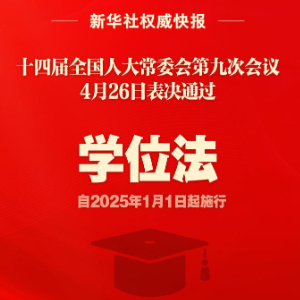 4月26日,十四届全国人大常委会第九次会议表决通过学位法,自2025年1月1日起施行。学位法共7章,包括总则、学位工作体制、学位授予资格、学位授予条件、学位授予程序、学位质量保障、附则。
