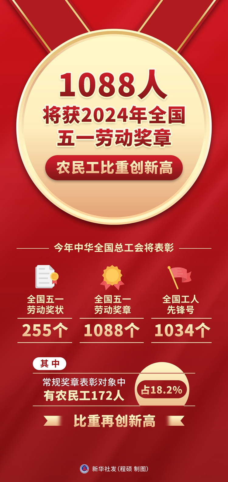 新华社北京4月27日电(记者樊曦、黄垚)“五一”国际劳动节即将到来。记者27日从中华全国总工会获悉,今年全总将表彰全国五一劳动奖状255个、全国五一劳动奖章1088个、全国工人先锋号1034个。其中,常规奖章表彰对象中有农民工172人,占18.2%,比重再创新高。