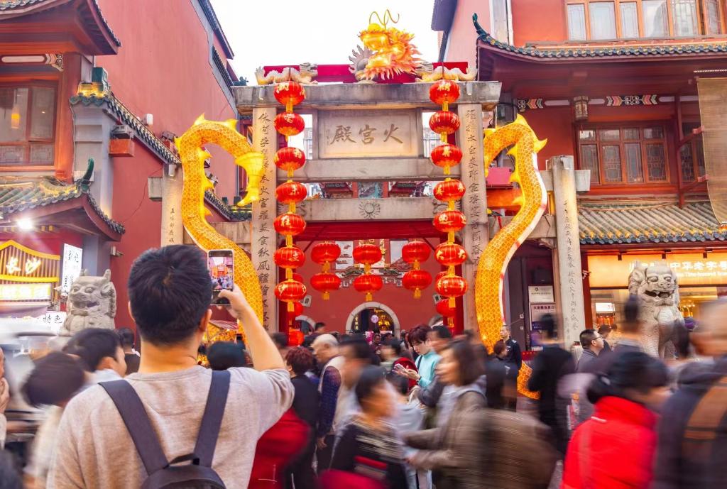 游客在长沙火宫殿牌坊前拍照“打卡”。(石亮 摄)