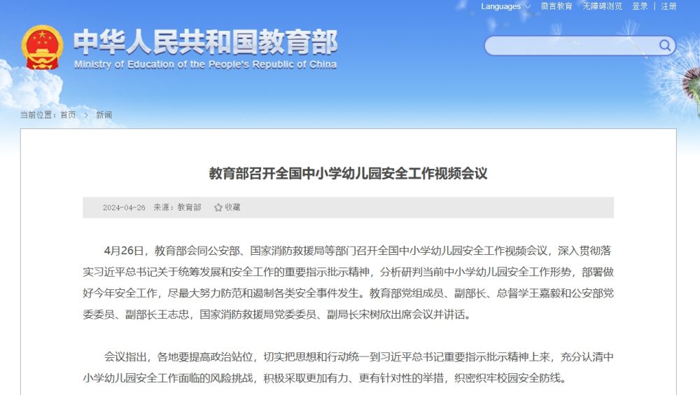 4月26日,教育部会同公安部、国家消防救援局等部门召开全国中小学幼儿园安全工作视频会议,深入贯彻落实习近平总书记关于统筹发展和安全工作的重要指示批示精神,分析研判当前中小学幼儿园安全工作形势,部署做好今年安全工作,尽最大努力防范和遏制各类安全事件发生。教育部党组成员、副部长、总督学王嘉毅和公安部党委委员、副部长王志忠,国家消防救援局党委委员、副局长宋树欣出席会议并讲话。