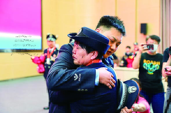 ▲4月26日,在呼和浩特市公安局荣退暨警号传承仪式上,索连红与同为民警的儿子包牧仁拥抱。新华社发(韩斌摄)