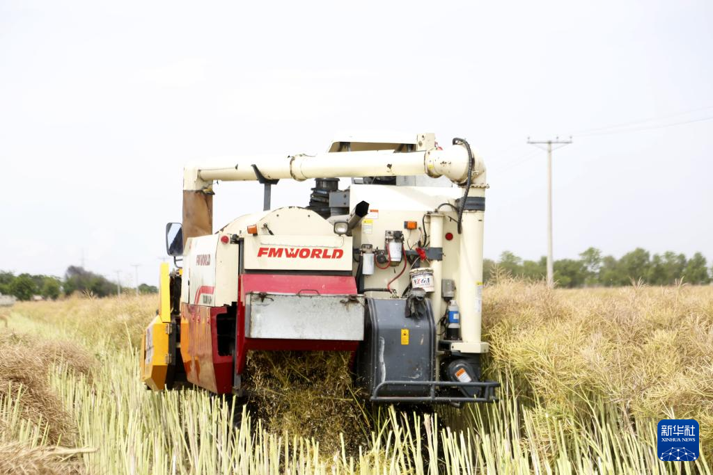 4月里,在巴基斯坦东部旁遮普省珀格尔地区一处农田,当地农民围在一台从中国引进的油菜籽收割机旁,观看机器收割作业的场景。机器一启动,地里微黄的油菜荚就整齐地倒在一旁,成熟的菜籽纷纷落在收割机的机箱里。