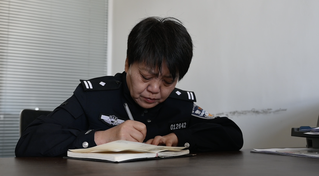 4月2日,民警索连红在小召前街派出所的办公室内记工作笔记。