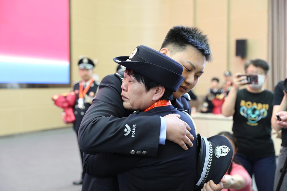 4月26日,民警包牧仁在警号传承仪式上拥抱母亲索连红。