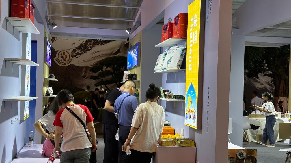 重庆解放碑商圈的“国际优品展”展台上,几位游客正在挑选泰国产品。新华社记者李晓婷 摄