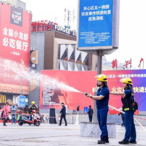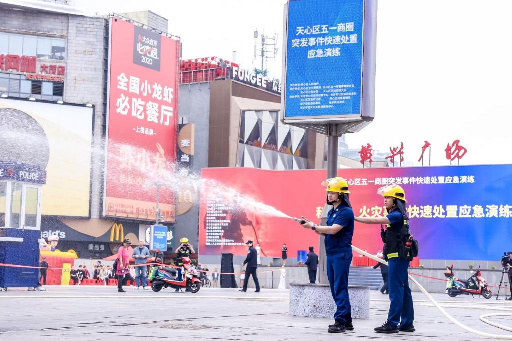 假期热点商圈人流量大,长沙等地集结公安、消防、卫健等应急保障队伍,举行应急演练,保障消费场所安全。