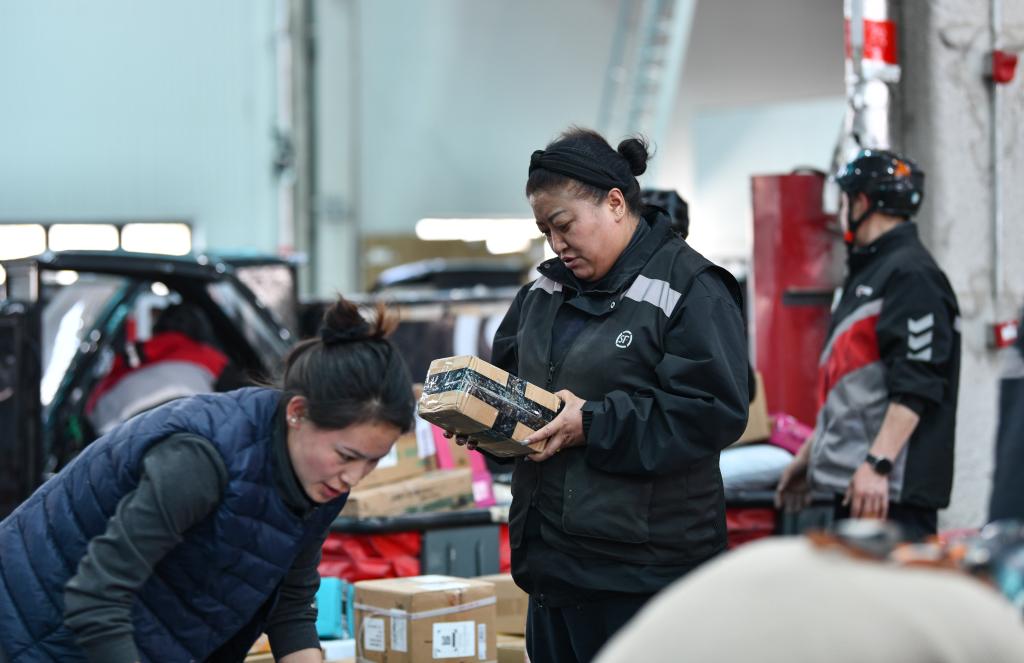 2024年4月22日,次仁措姆(中)和同事一起分拣快递。新华社记者 晋美多吉 摄