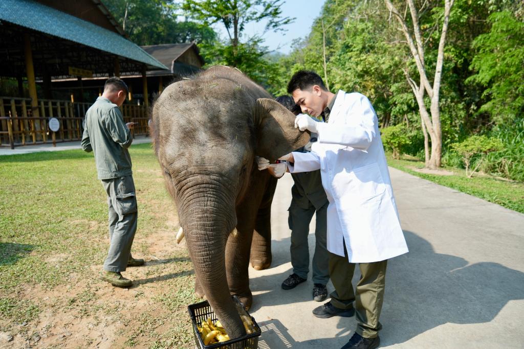 2024年4月25日,熊朝永(右)给救助象龙龙体检。受访者供图